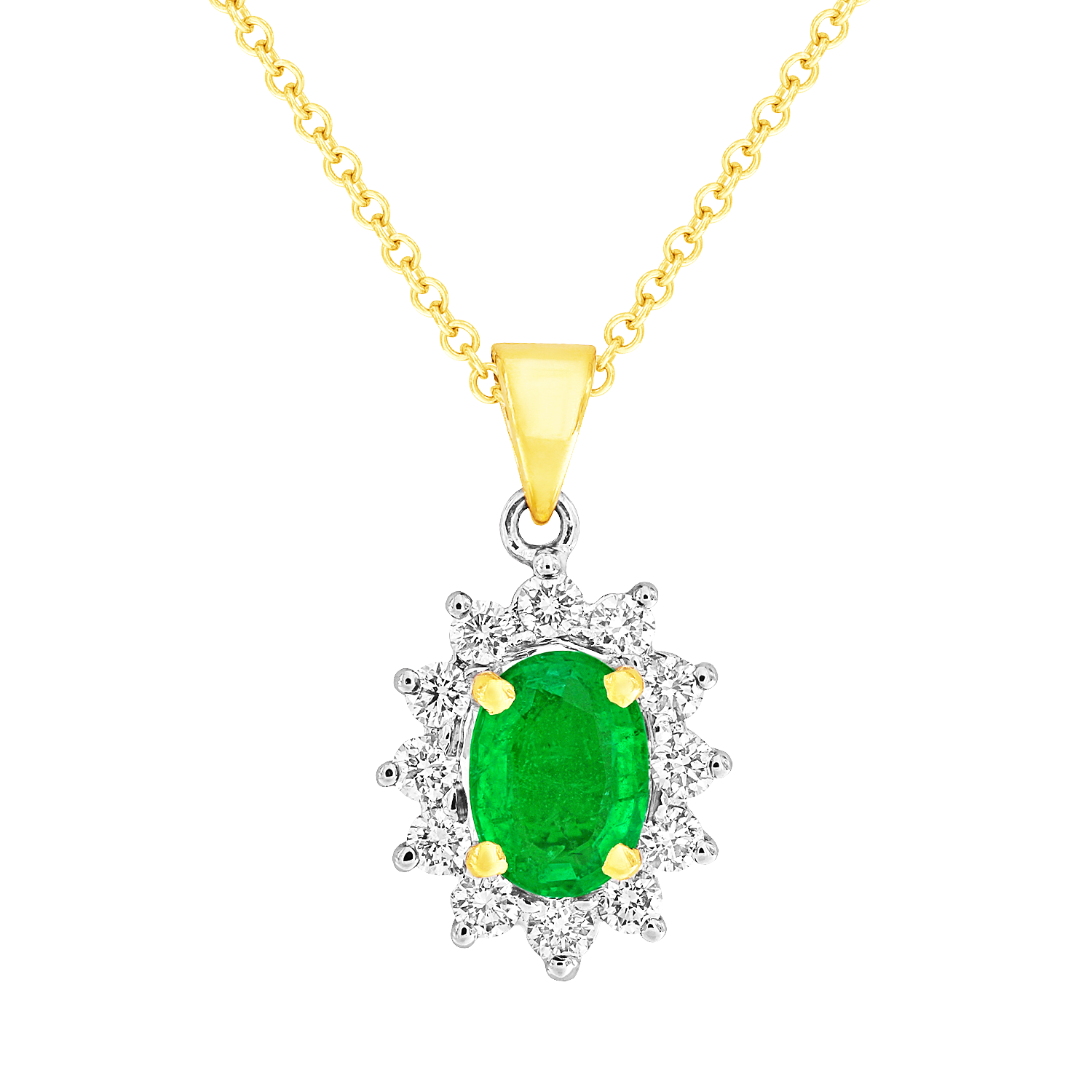 This 18ct white gold pendant features a round emerald at the centre, framed by a cluster of sparkling diamonds. A simple, elegant piece that adds colour and sparkle to any look.