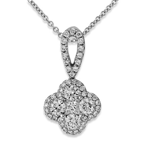 Exquisitely crafted in 18ct white gold, this striking pendant features a cushion-inspired motif adorned with a dazzling array of round brilliant diamonds. Finished with a diamond-set bale, it exudes timeless elegance.
